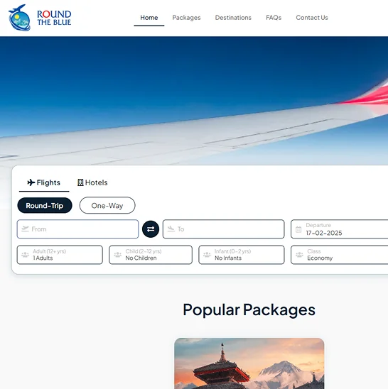 RoundTheBlue is a website that enables users to easily book flights, hotels, and vacation packages. The design focuses on providing an intuitive and simple booking experience, ensuring users can plan their trips without hassle. By emphasizing affordability and ease of use, the website caters to travelers looking for convenience and reliable service. We developed this website to reflect RoundTheBlue's commitment to offering stress-free travel planning for every user, with a seamless, user-friendly interface.